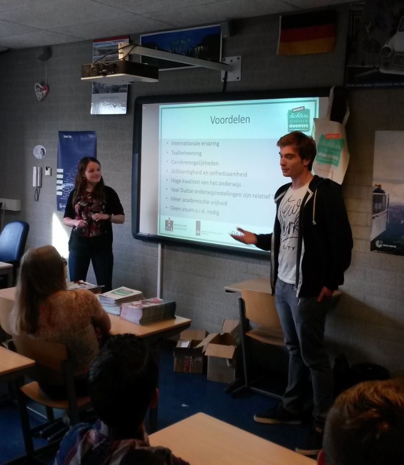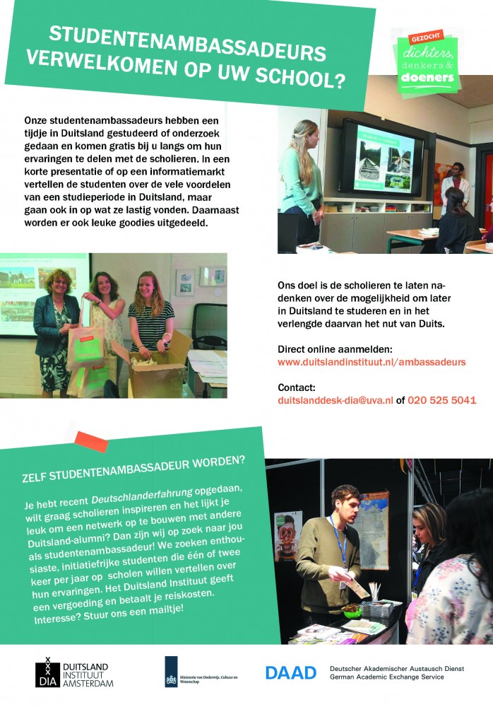 Deutschlanderfahrung opgedaan, wil graag scholieren inspireren en het lijkt je leuk om een netwerk op te bouwen met andere alumni? Dan zijn wij op zoek naar jou als studentenambassadeur Studeren in Duitsland! Wij zoeken enthousiaste, initiatiefrijke studenten die op scholen willen vertellen over hun ervaringen met studeren in Duitsland. Je krijgt per schoolbezoek een vergoeding van het Duitsland Instituut en kunt je reiskosten declareren. Interesse? Stuur ons een mailtje via